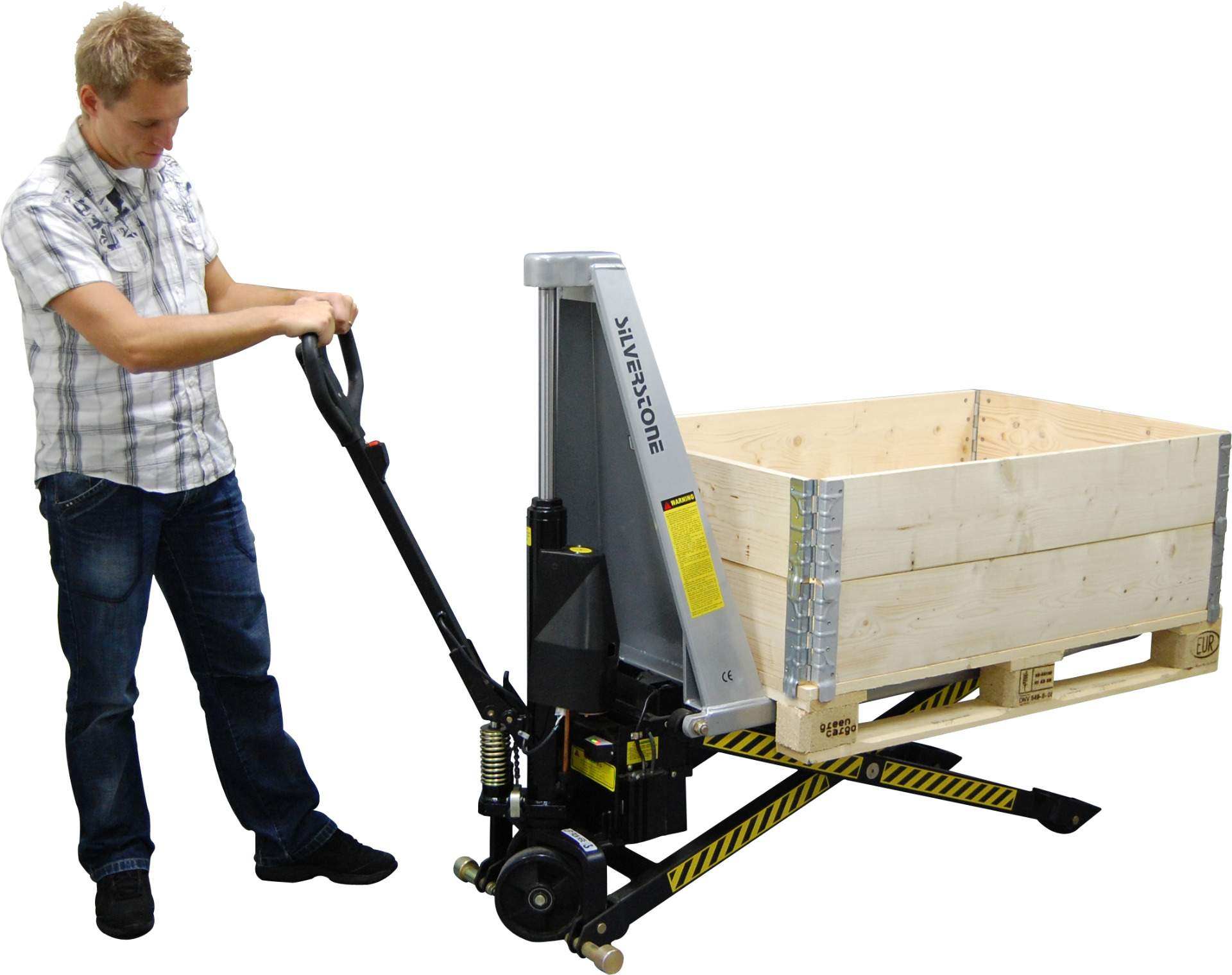 SE1056 har en inbyggd laddare med ett 60Ah/12V batteri som standard vilket ger många driftstimmar per laddning. SE1056 har snabba lyft- och sänkhastigheter. Polyuretanhjul.